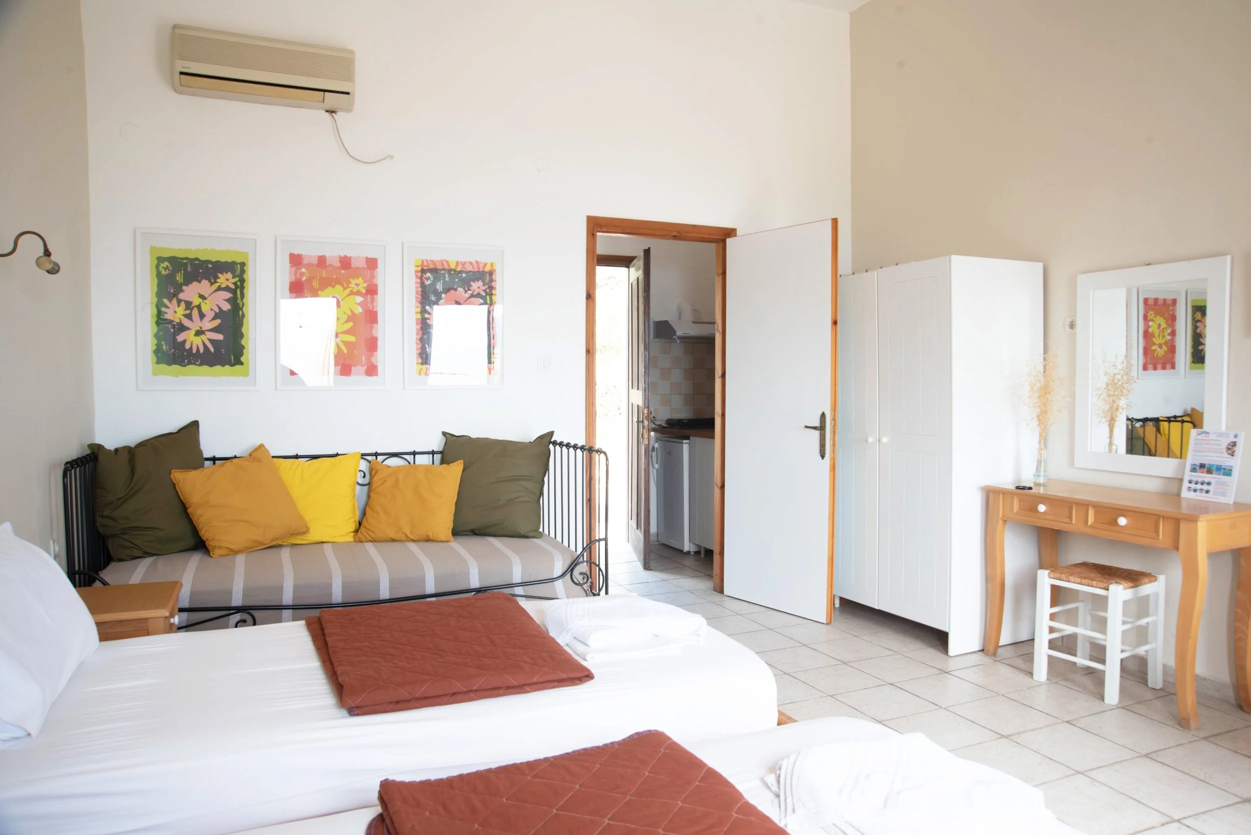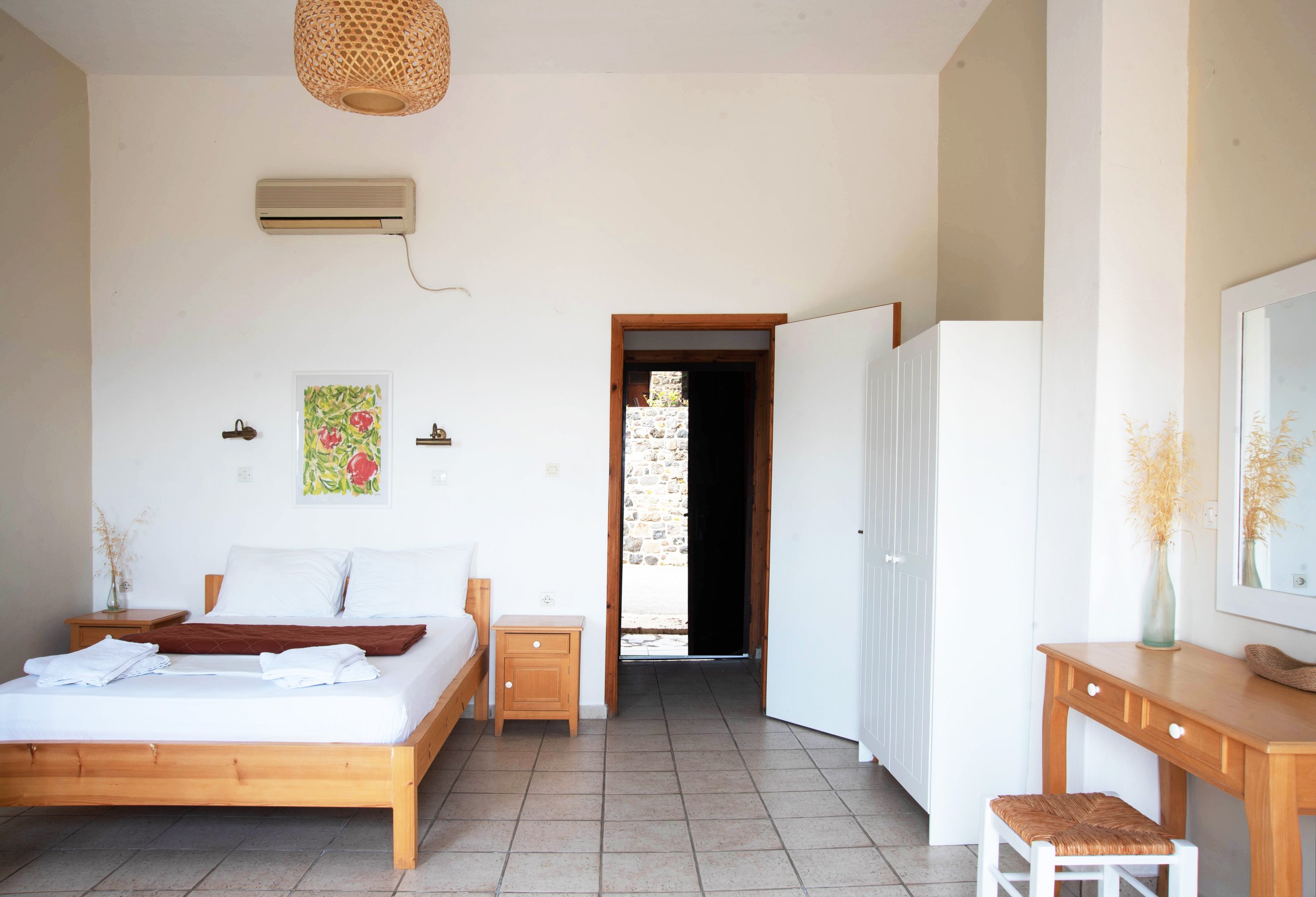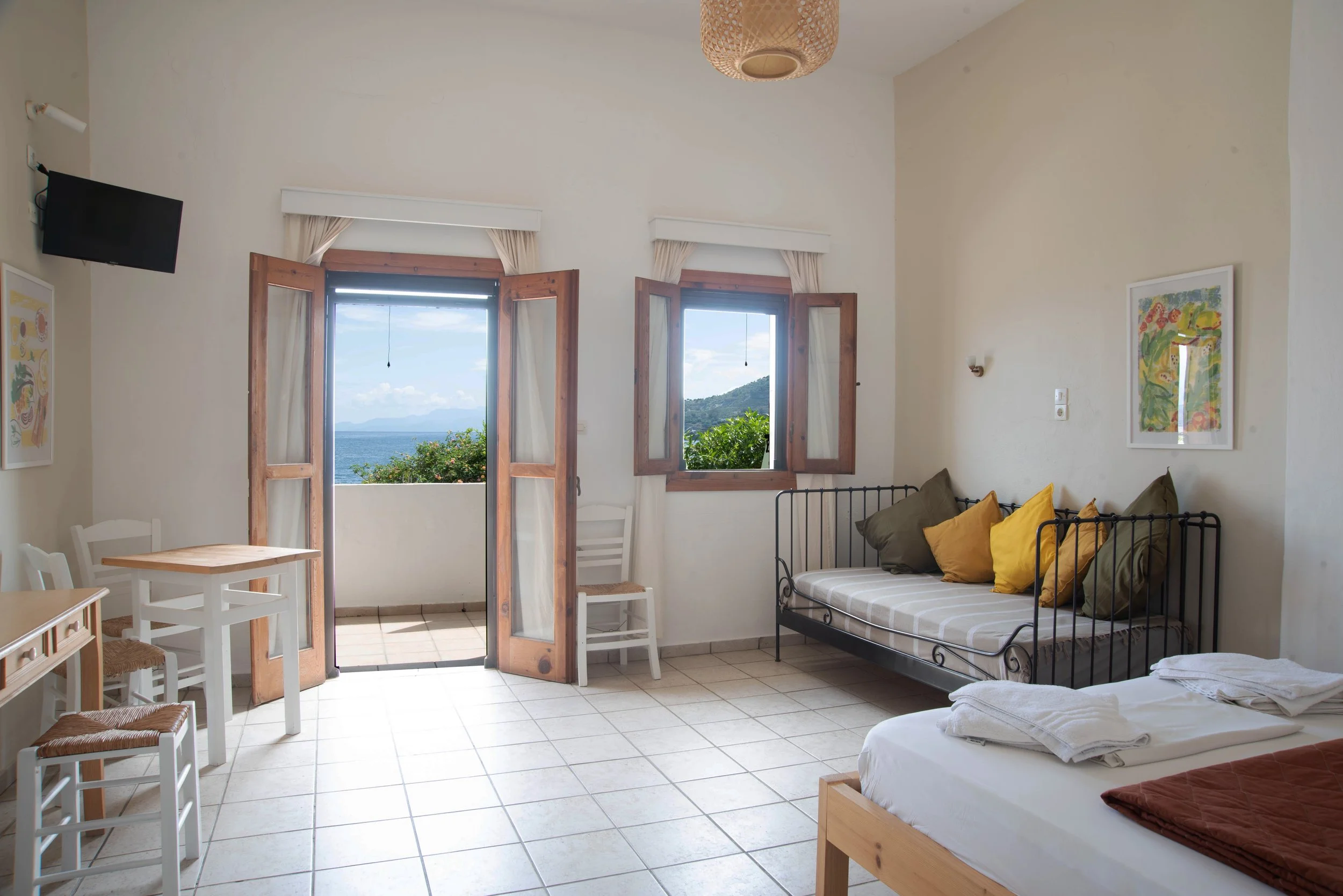 All our studios have air conditioning, high ceilings and a private terrace with umbrella overlooking the Aegean Sea. They are perfect for families